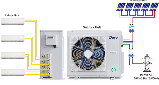 Eliminando a necessidade de armazenamento externo de bateria, este sistema integra um amplificador solar MPPT de alto desempenho e um inversor CA/CC de modo duplo diretamente em sua unidade externa centralizada. A tecnologia MPPT garante a captura máxima de energia solar ajustando-se dinamicamente às flutuações de intensidade da luz solar, enquanto o inversor integrado permite a alternância perfeita entre a energia solar DC e a rede AC, priorizando o fornecimento de energia renovável para minimizar a dependência das redes elétricas tradicionais. Ideal para propriedades residenciais com vários cômodos ou pequenas instalações comerciais, ele oferece controle de temperatura consistente e específico para cada zona, ao mesmo tempo que reduz os custos gerais de energia e a pegada de carbono.